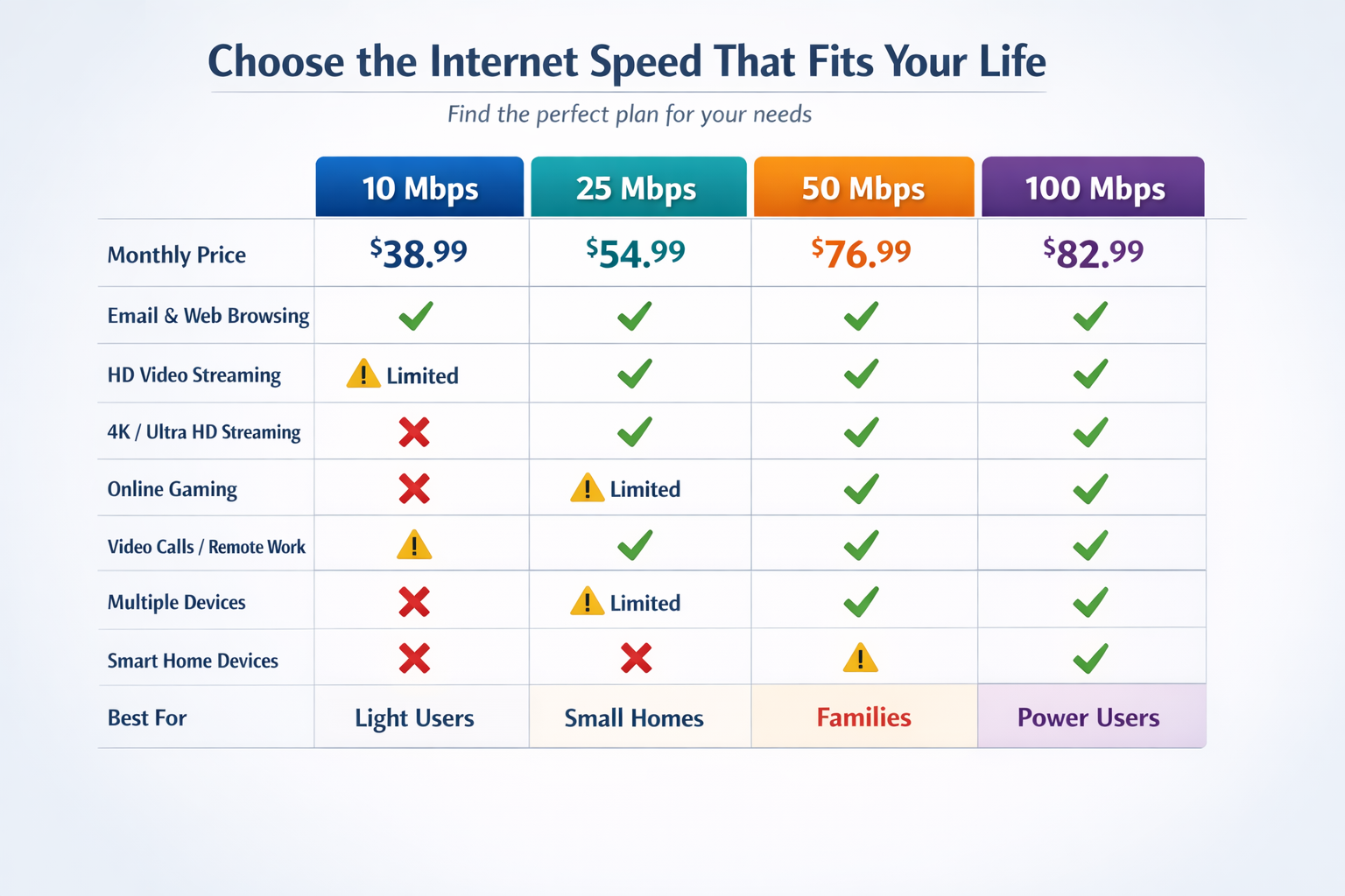 This chart compares our internet plans to help you quickly choose the speed that best fits your needs. Each column shows a different speed option with its monthly price and what activities it supports, from basic web browsing to streaming, gaming, and smart home use. Check marks indicate full support, warning icons show limited performance, and X marks mean the activity is not recommended at that speed. As speeds increase, you get better performance for multiple devices, remote work, and high-definition streaming, making it easy to see the value of upgrading.